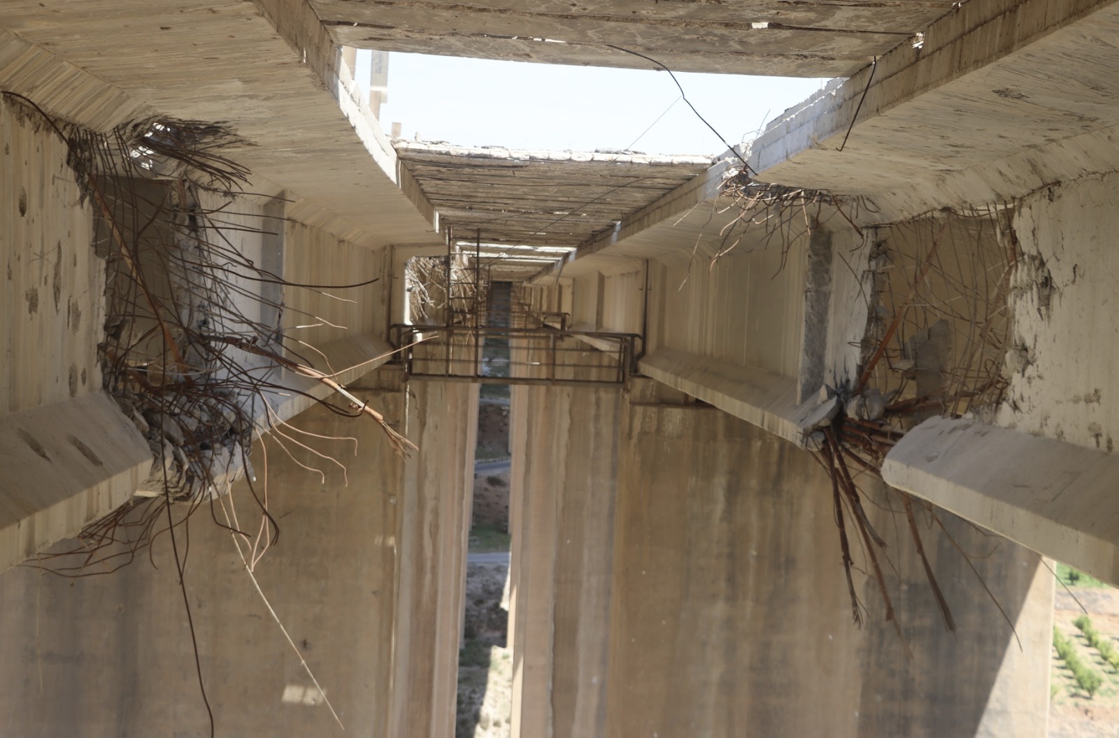 - القسم العلوي: تعرضت بعض الجوائز والبلاطات الرابطة لأضرار كبيرة كظهور وانقطاع حديد التسليح وتكشف وانقطاع للكابلات مسبقة الإجهاد ، بما في ذلك تهشم البيتون وتشوه التسليح، بعض الفتحات تحتاج إلى إصلاح أو استبدال كامل.